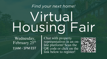If you are looking for off-campus housing, start your search with the click of a button at our Virtual Housing Fair! Representatives from several local apartment communtiies will be available in "Live Chat" meeting rooms to show off their apartments and answer your questions. Scan the QR code above or CLICK HERE to register!